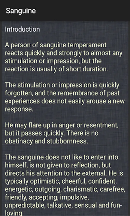 Discover whether you are a sanguine, choleric, melancholic, or phlegmatic.