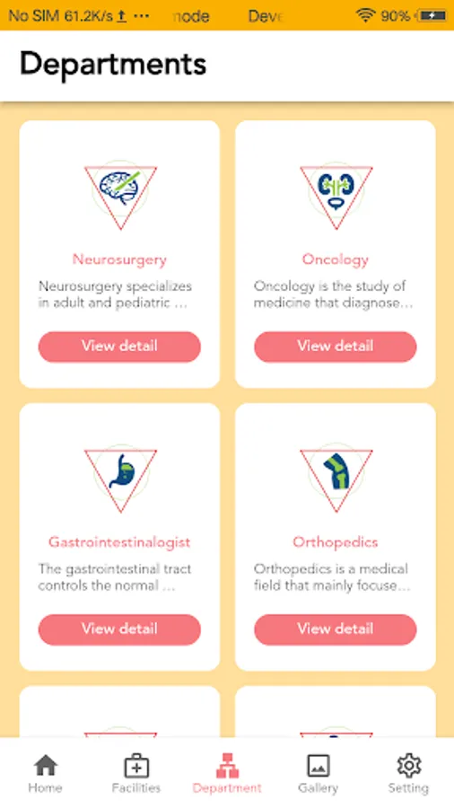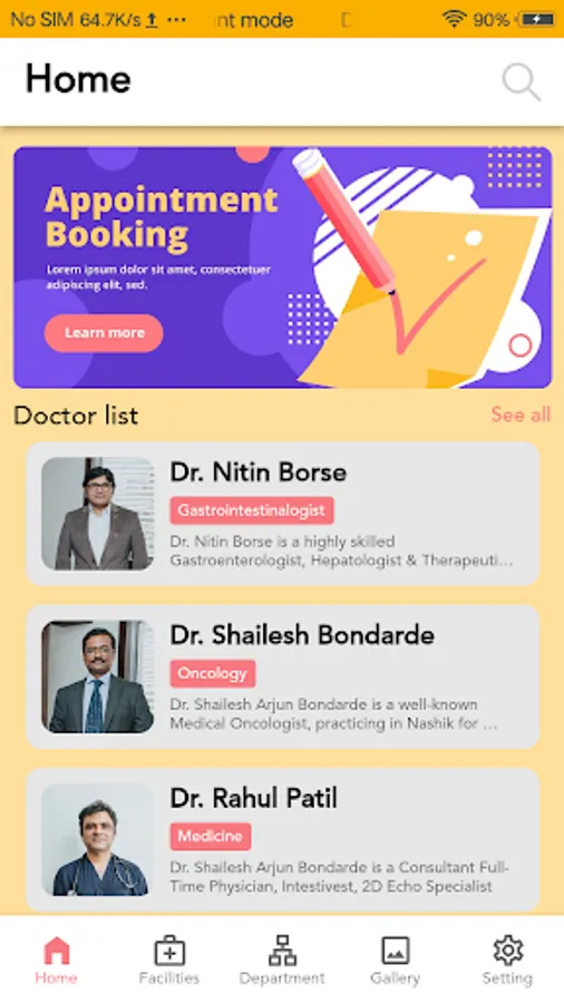 Patient Care app includes complete management including book appointment to doctors, department list and details including price for services in each department, also you can check doctor list sorted by department.