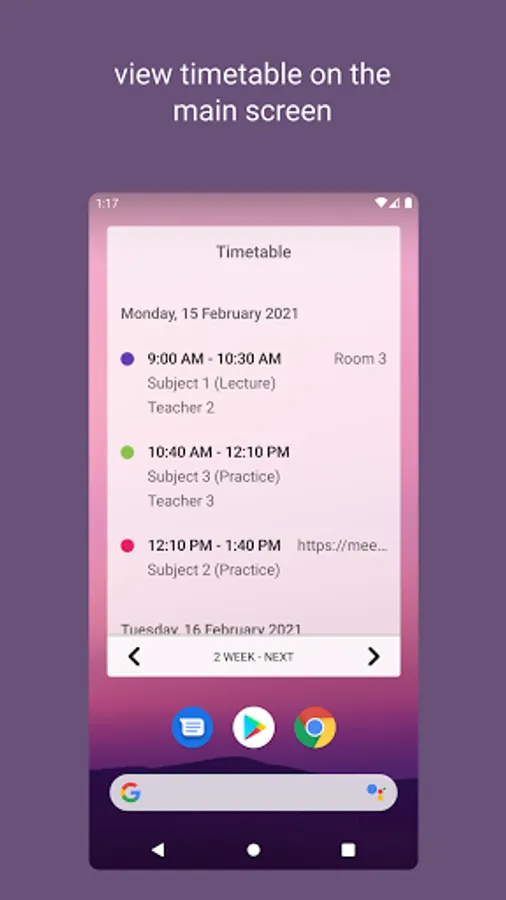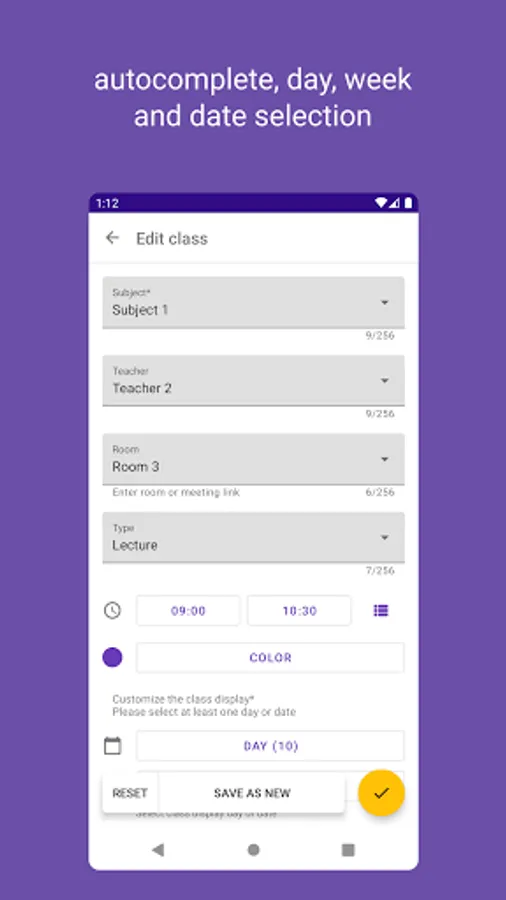 The application provides a convenient constructor for creating and editing timetable, autocomplete fields with already entered data, add classes for several days of the week, show or hide classes on the selected date