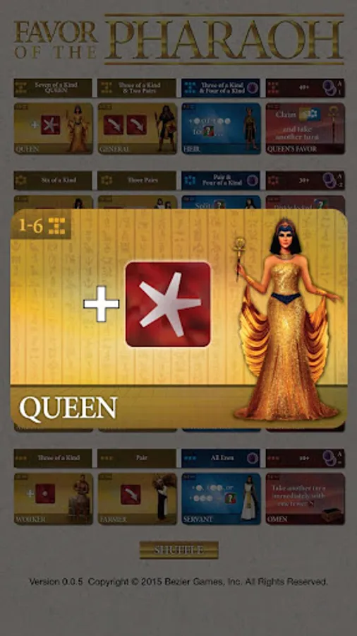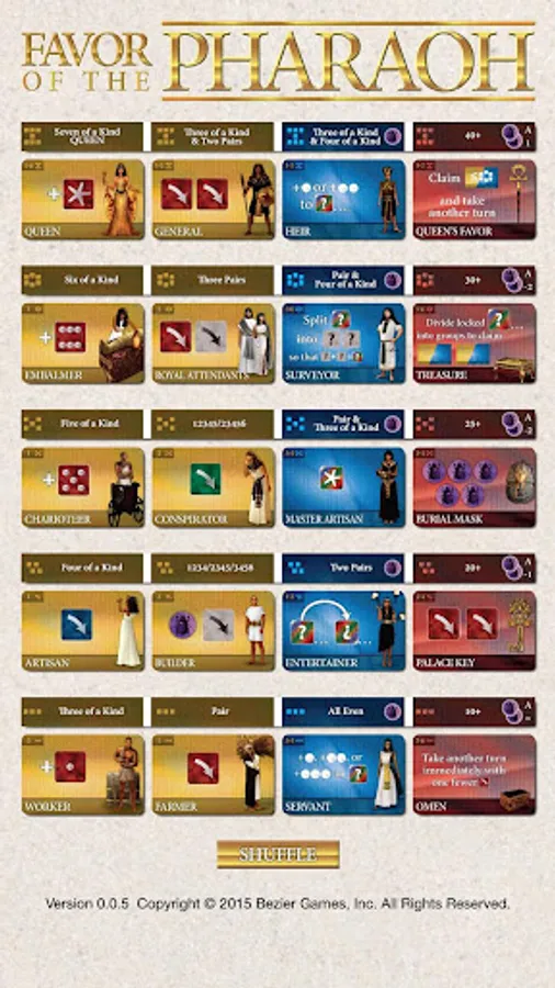 The Favor of the Pharaoh companion app provides the default setup for tiles and level bars, and then with a tap of the Shuffle button, randomizes the tiles and level bars. The app chooses from all of the possible 50 different tiles, enabling billions of possible combinations.