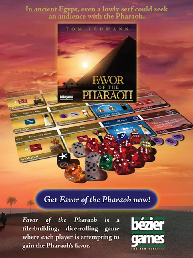 Requires the Favor of the Pharaoh board game, available direct from beziergames.com, or at all online and local game stores.