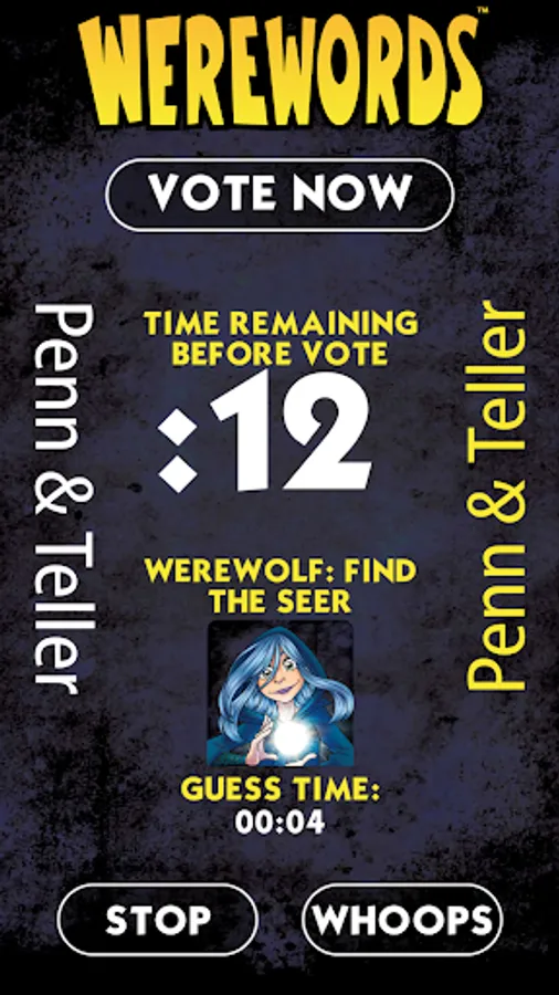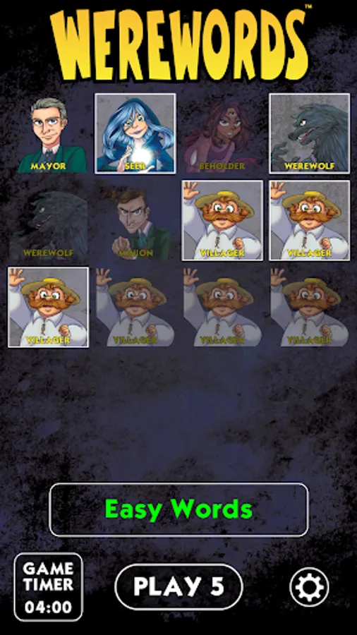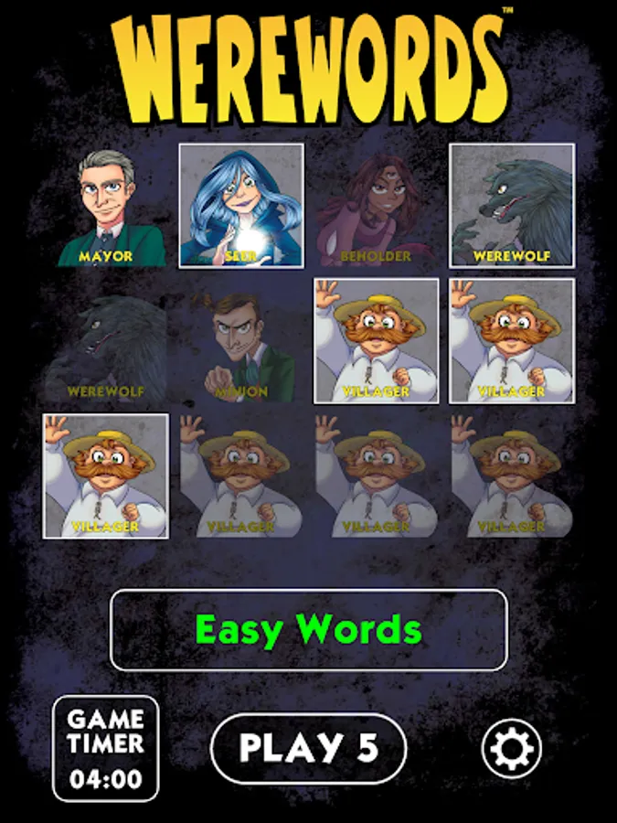 To use the app: Choose the roles you are using in the game from Werewolves, Seer, and Villagers (and special bonus roles Minion and Beholder), then tap the Play button to start the game. The app will ask all of the players to close their eyes, then wake up the Mayor and any other selected roles in order. Then the app will ask all player to open their eyes, and the day timer will start. If the players guess the Magic Word before time is up, the Mayor taps the "Correct" button, and then the Werewolves can still win if they figure out who the Seer is. If the players do NOT get the Magic word before time is up (or if they run out of Yes/No tokens), the players can still win by figuring out who one of the werewolves is.