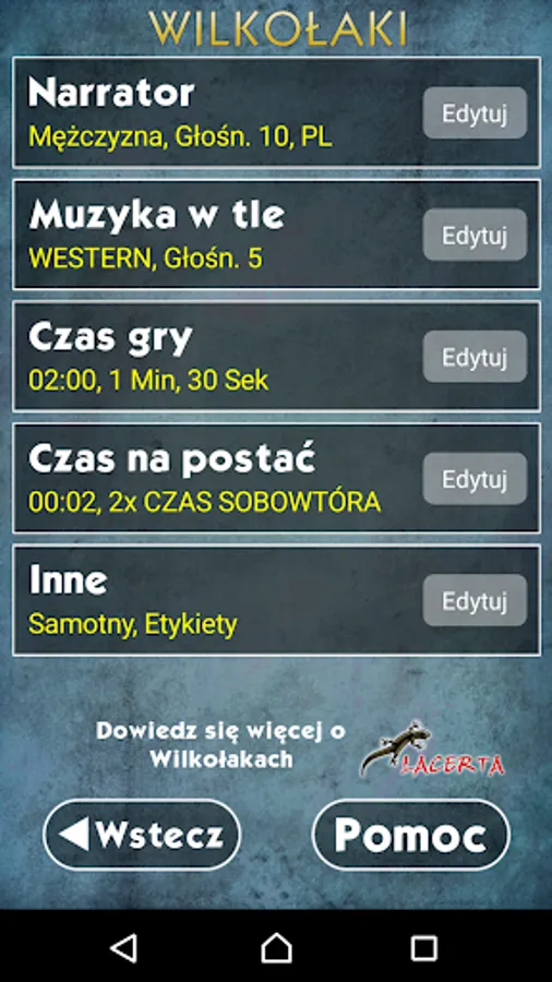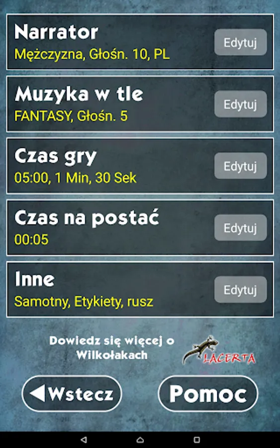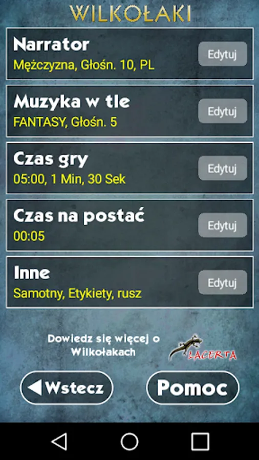 Click the gear icon in the lower right corner to go to the settings screen applications. This screen allows you to adjust various aspects of the application to the game Werewolves.