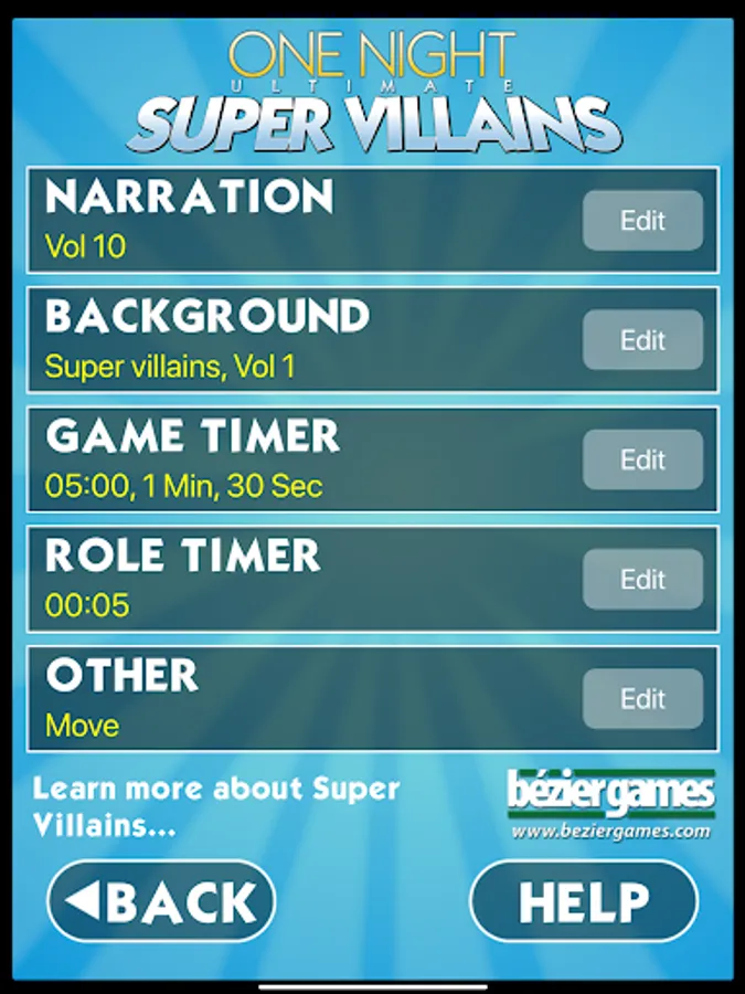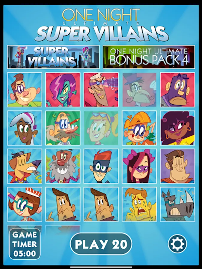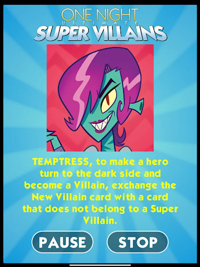 While this free companion app is not required, it provides amazing narration from Eric Summerer that guides players through the night phase of the game. Super Villains features artwork from One Night artist Gus Batts, done in the classic 90's Cartoon Network™ style.