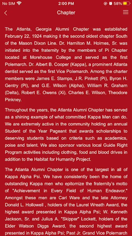 The mobile app for the Atlanta Alumni Chapter of Kappa Alpha Psi Fraternity, Incorporated is a place for brothers to stay updated about meetings, events, and happenings within the organization. Also, you can use this app to view the history of Kappa Alpha Psi, to access chapter documents, to stay connected with our social media sites (Facebook and Twitter) and much more.