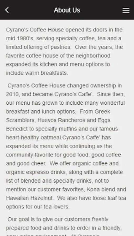 The Cyrano's Caffe app gives customers instant access to information about Cyrano's. Key Features Include: -Menu -Contact Information & Directions -Push Notifications -Social Media -Loyalty Program