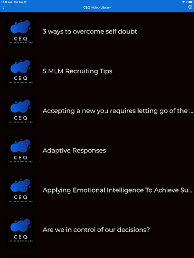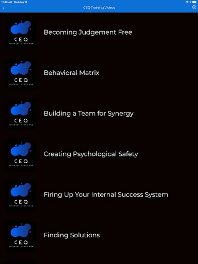 Welcome to your CEQ training app! We will show you all about Emotional Intelligence and how it can grow the sales of your business. This app is targeted for business owners and sales professionals everywhere who want to learn how to strengthen their EQ. It has training videos, workbooks, quizzes, personality tests and much more to help you achieve your goals!