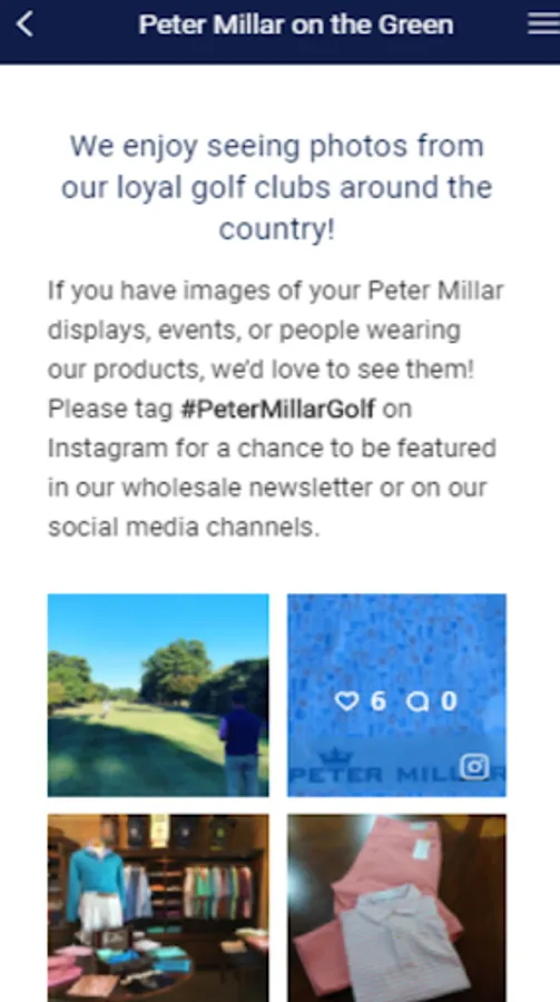 Peter Millar's PGA Pro App is designed to provide a place to host all golf content relevant to PGA Golf Professionals, Teaching Professionals and Assistant Professional. Content shared on the app will include shop merchandising tips, Peter Millar company news, golf industry news, and provide a platform for PGA professionals across the U.S. to connect. App features to include Assistant Golf Professional Spotlights, News Feed where golf shop photos and instructional videos can be shared.