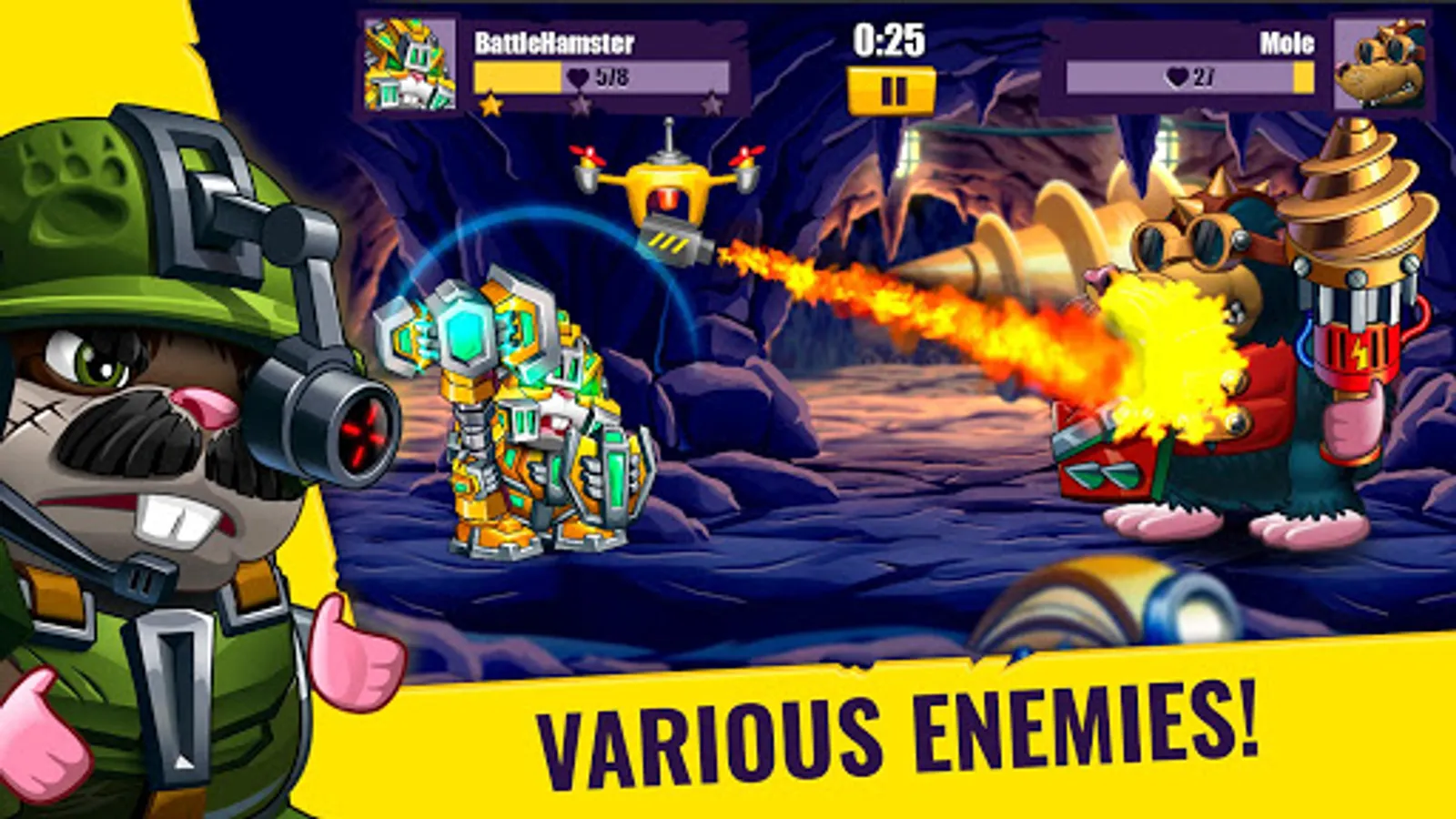 Evil Aliens captured our Planet and turned all people into animals! But the brave Hamsters still keep up! Fight for the brave Hamsters, defeat Bosses, collect Super Weapons and destroy the Alien battleship!