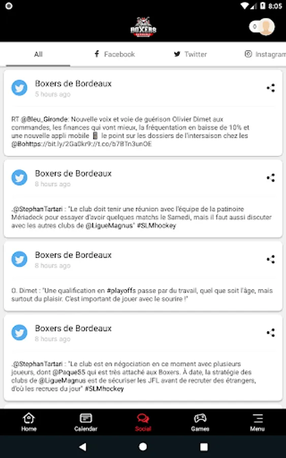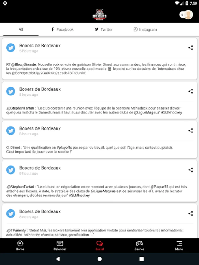 - Les posts sociaux, TOUS accessibles au meme endroit (Facebook, Twitter)