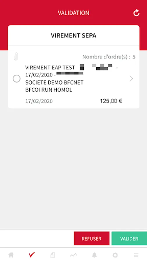 The validation of operations via Smartphone must be configured under BFCNET ENTREPRISE by the administrator. The mobile user then receives a notification indicating that an operation is to be validated.
