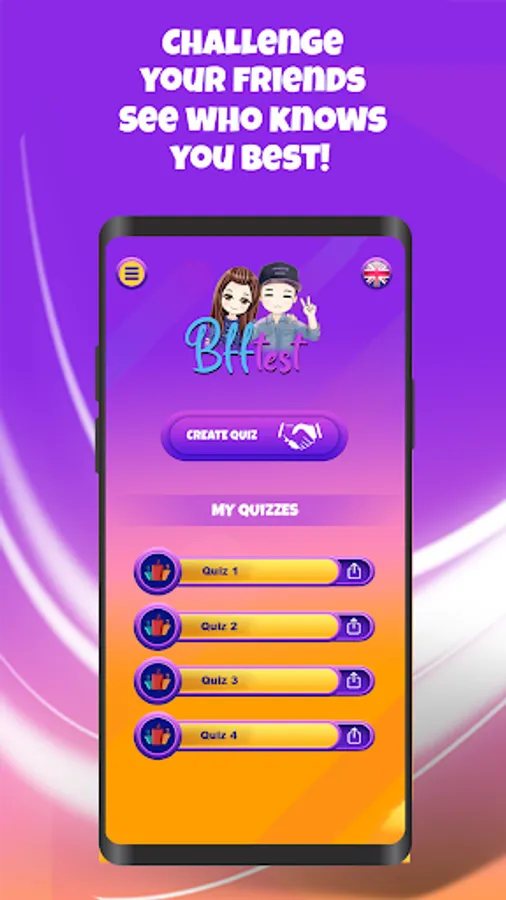 The question is - how well do you know me? Create a best friend test with 10, or 20 questions for a BFF challenge! This fun friendship app lets you make and share fun quizzes to check compatibility scores! All your friends and family can compete, and the person with the highest score on the leaderboard knows you best! But hey, this is not just a friends trivia! Use this app as a couple quiz and see if your boyfriend or girlfriend truly knows all your likes and dislikes.
