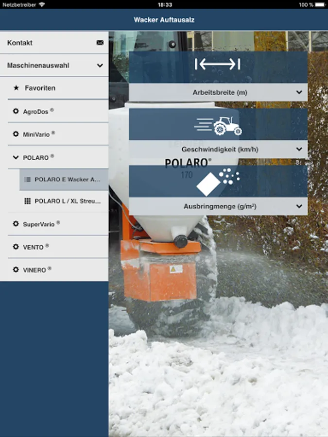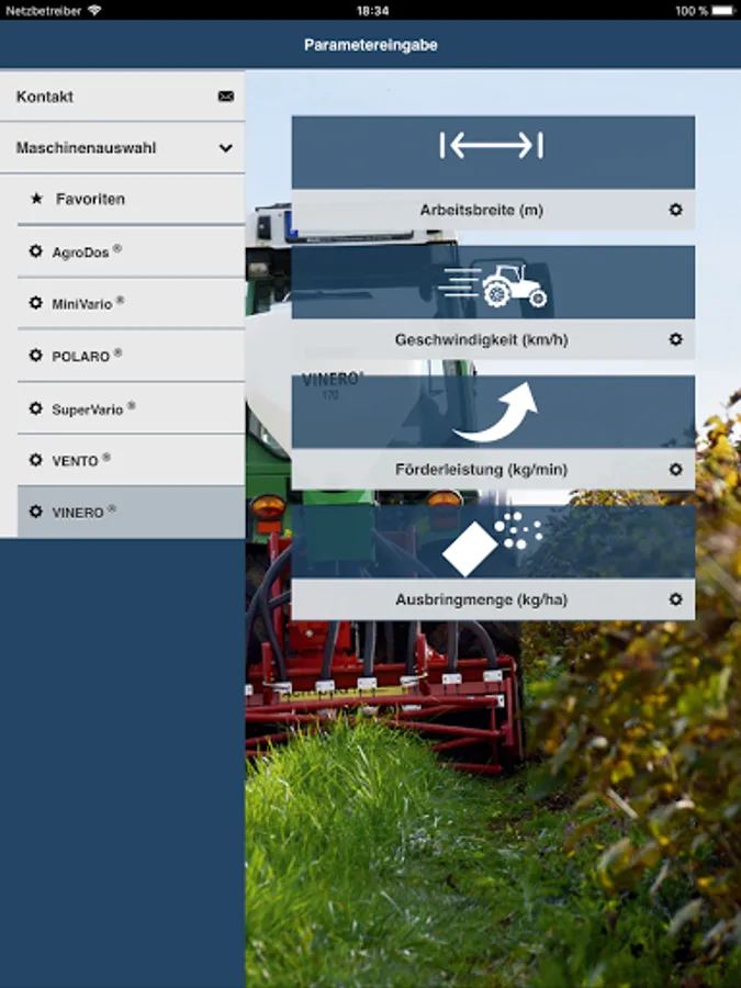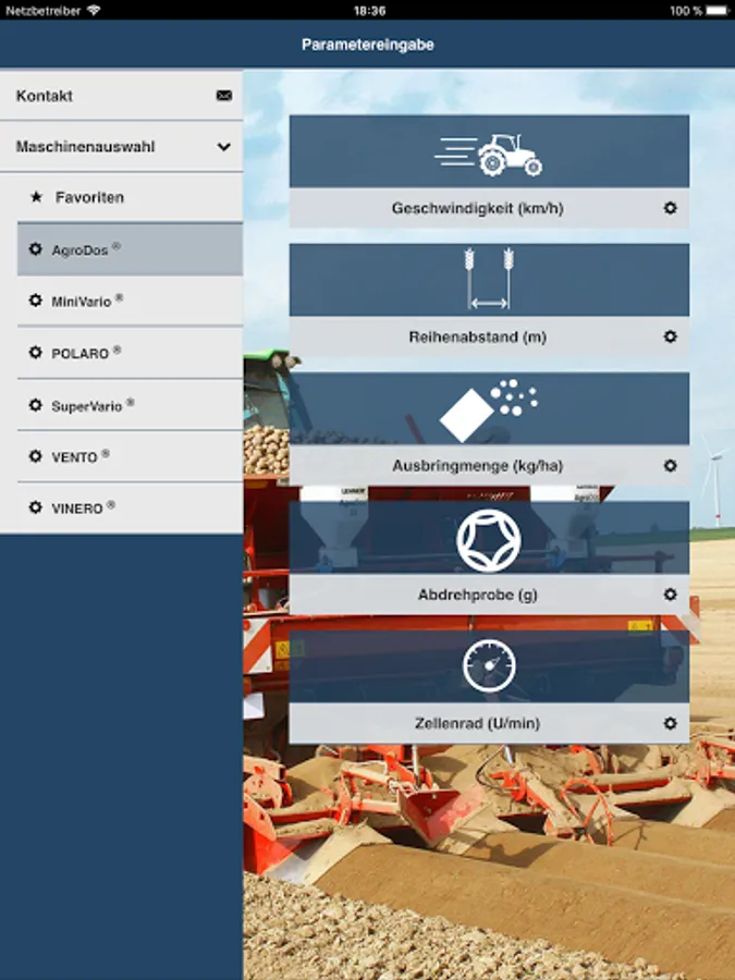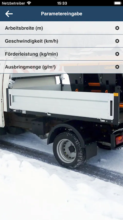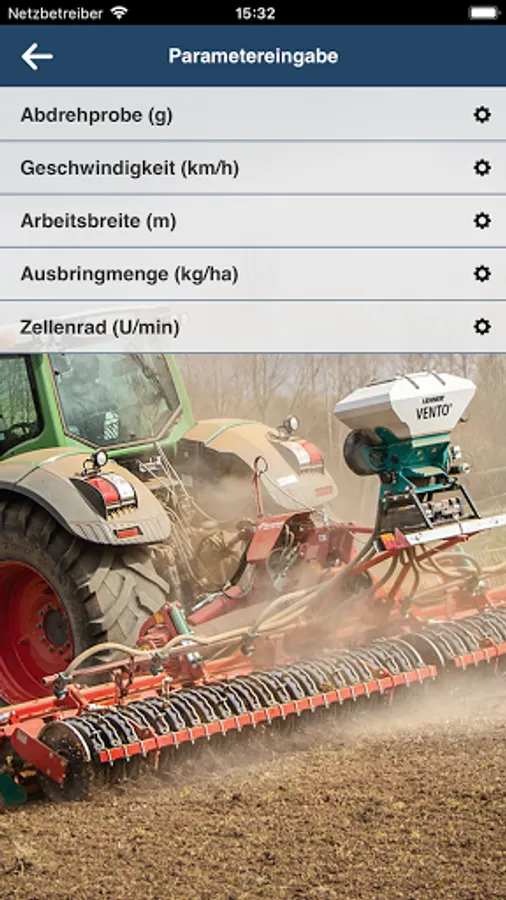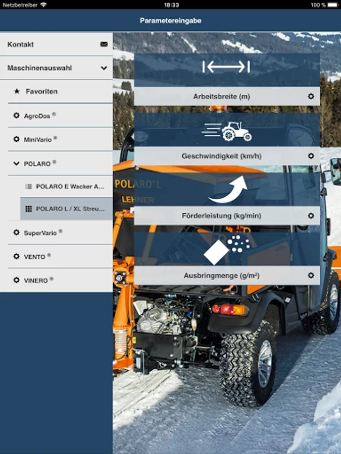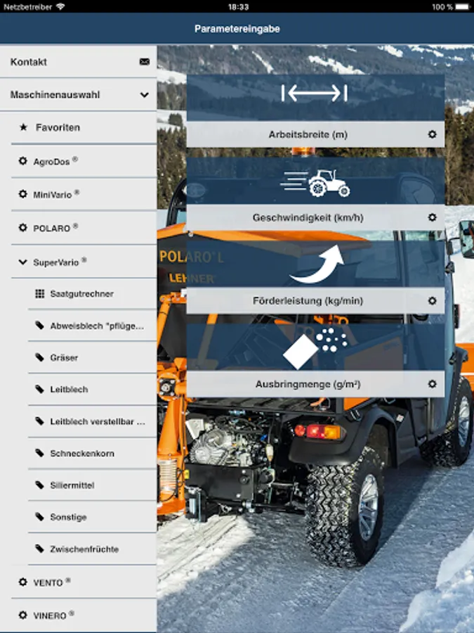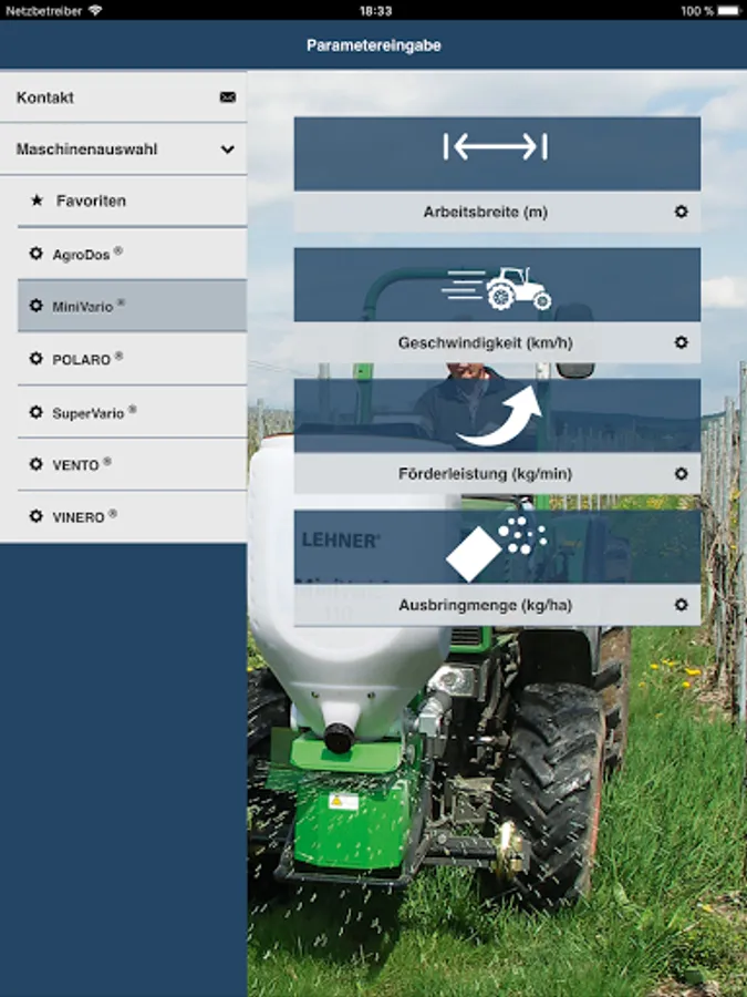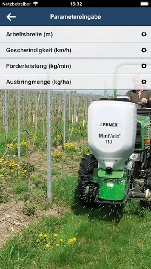 You select the granulate you wish to apply, then enter the spreading rate, speed and working width and the app will show you the required setting for your LEHNER spreader.