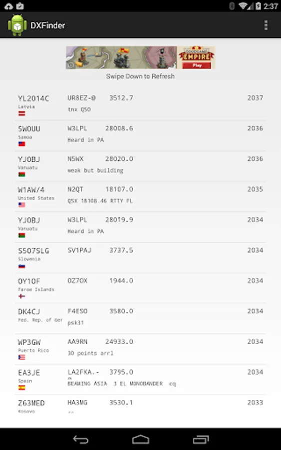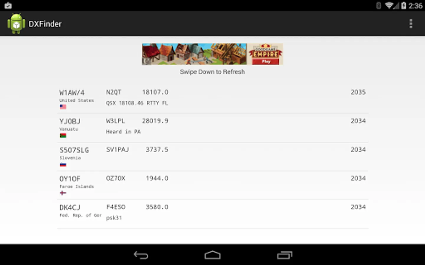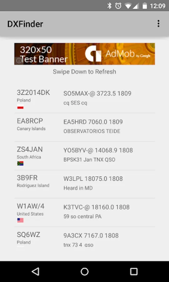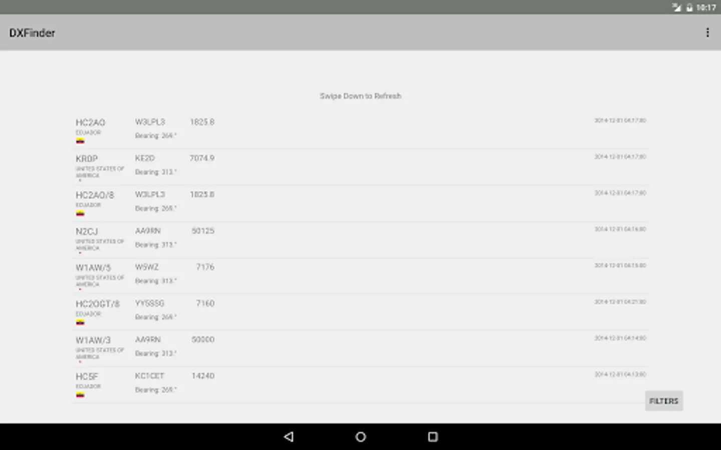 DX Finder helps you find DX spots on your Android Device. DX spots are listed newest to oldest. Each DX spot shows the call sign of the DX station, DE station, radio frequency, UTC time, and antenna bearing based on your devices current location. DX cluster data retreived from http://dxfinder.bfielding.com/ .