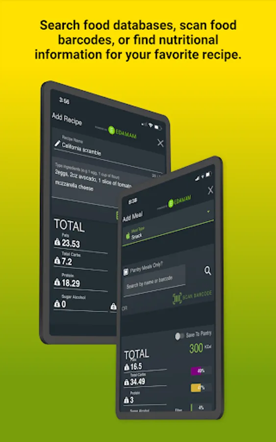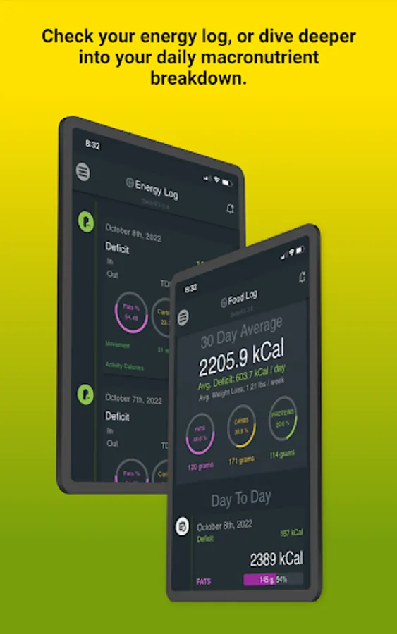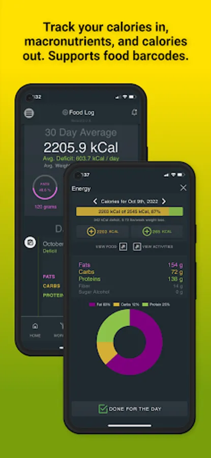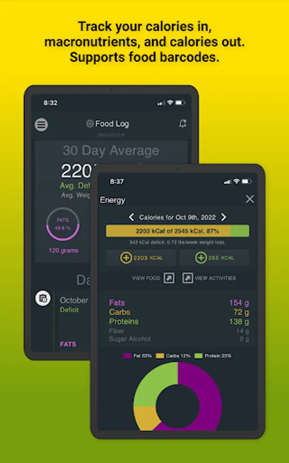 Track your macronutrients and calories consumed using our massive food database and see your daily deficit or excess. Scan food barcodes and find nutrition values for any recipe.