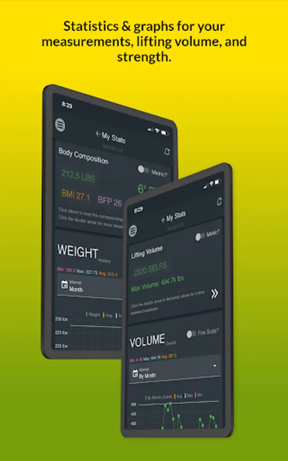 Maintain a historical view of your body composition (weight, body fat, TDEE, BMI), use various tools and calculators (to build muscle mass), and track your measurements over time to see your progress with beautiful charts and graphs.