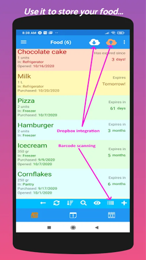 • Add products by scanning their barcode. The first time you scan a new product, you will need to enter its details manually, because the app does not depend on external services to retrieve the product name. Starting from the next time, the app will remember the name of the product, the category, the quantity, the unit of measure of the quantity and the expiration date entered for the last scan.