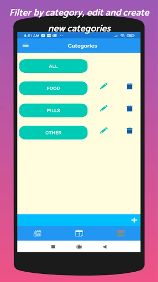 • View products grouped by categories. Three default categories are provided at app start, but you can delete them and create your own.