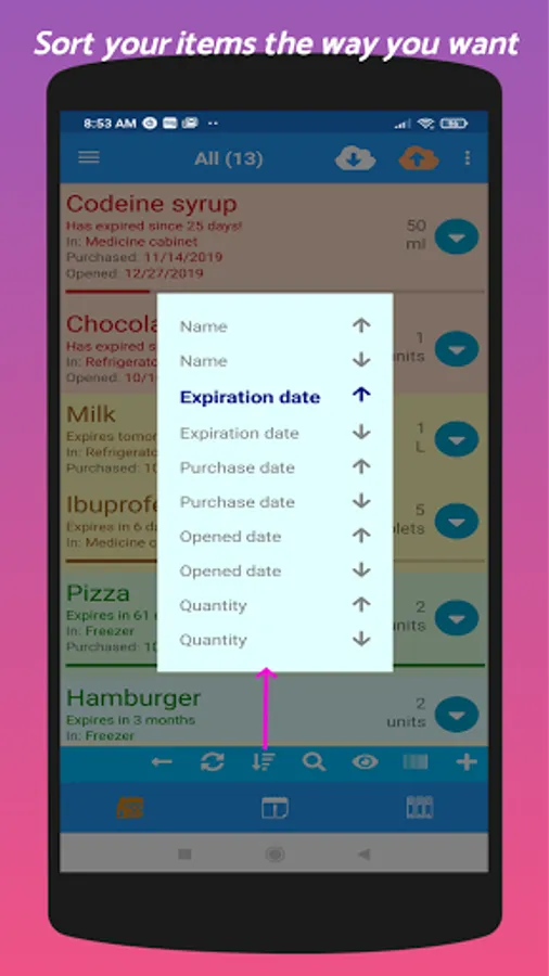 • Sort products by name, expiration date, purchase date, opened date or remaining quantity.