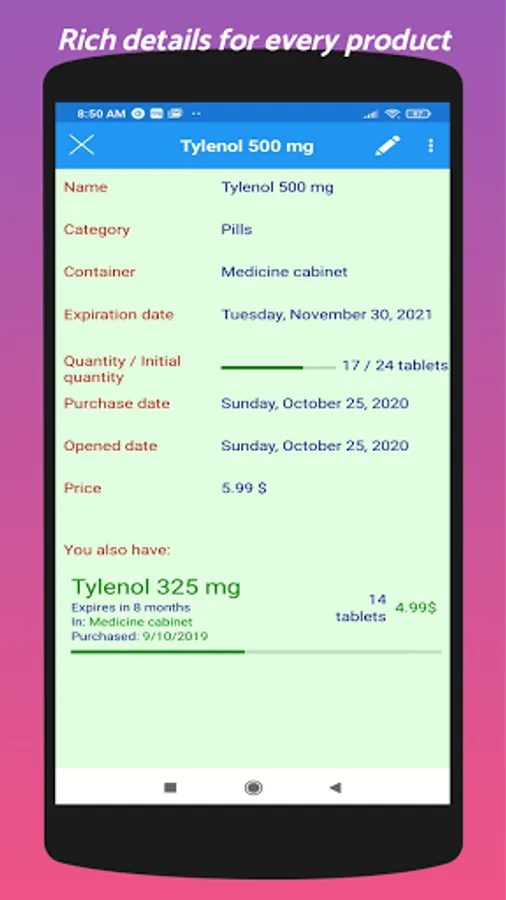 With this app, you can quickly and easily store and retrieve information about your products: quantity, initial quantity, expiration date, purchase and opened dates, container (where the product is stored), price, and notes.