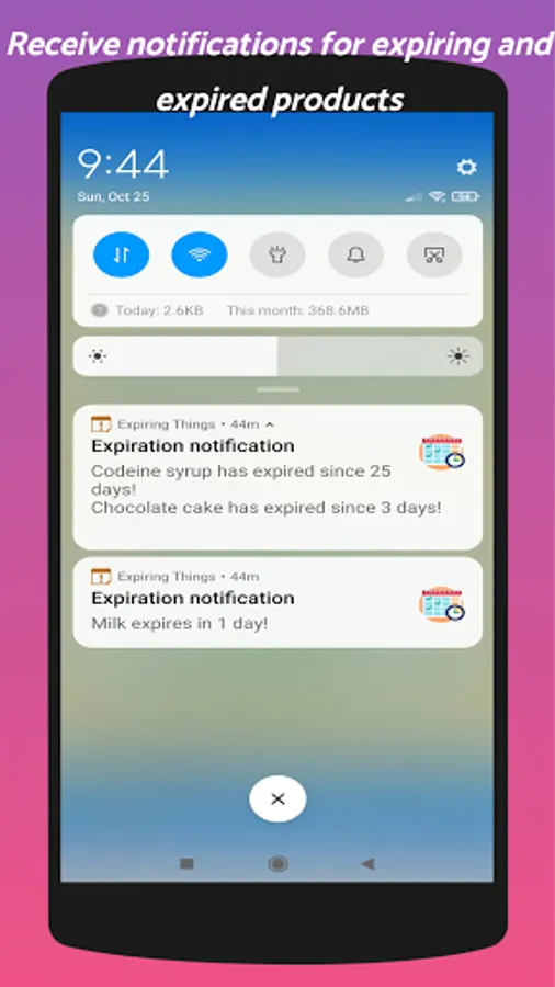 • Receive a notification when a product is about to expire. You receive three different notifications for each expiring product and you can change the timing on a per category basis. You can also choose to receive daily notifications for already expired products .You can set the time of the day at which notifications are fired. Please review your device's battery optimization settings if you don't receive notifications, or contact the developer for help.