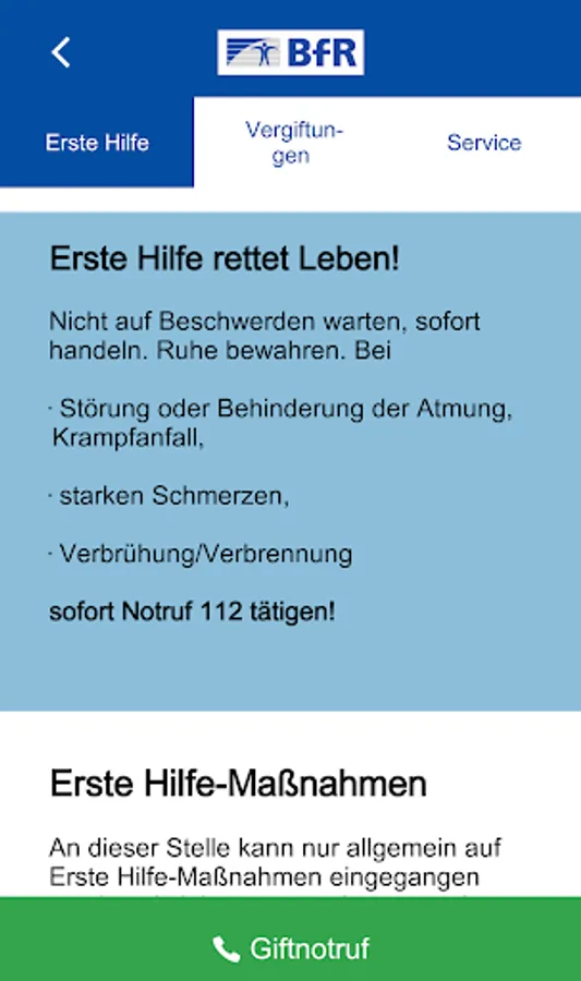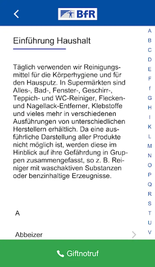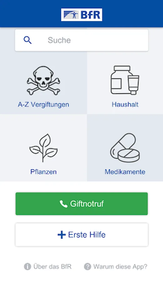 The BfR app is an advisor and a helper at the same time: It is intended to convey knowledge to protect infants and toddlers from poisoning. The app contains tips for child-proof storage of medicines, household chemicals and products. It gives important information that can save lives in an emergency: First aid measures are explained for all poisoning accidents, the picture of the poisoning is described in detail and the presentation to a pediatrician / children's clinic is clarified.