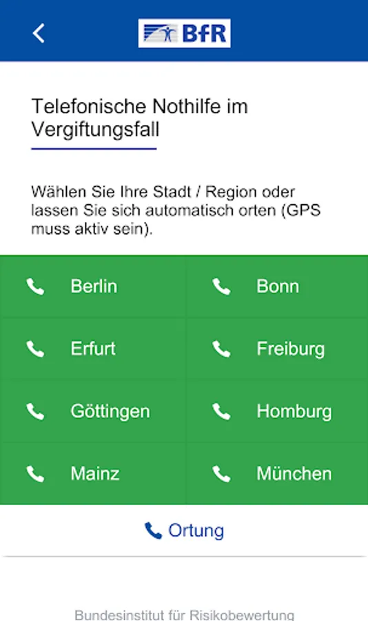 The responsible poison information center in a federal state can be called directly from the app. Via geolocation it is possible to establish a connection to the responsible poison control center.