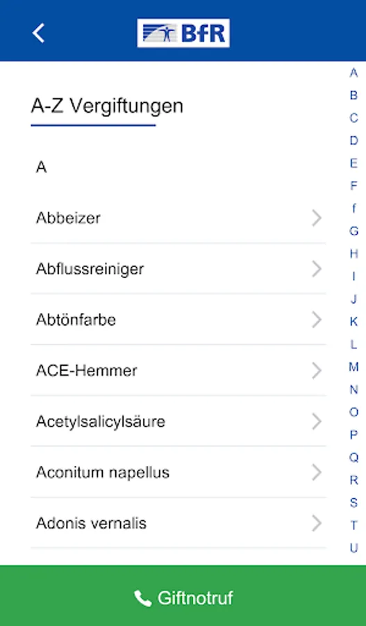 1. Under "A-Z Poisoning" you will find all the products mentioned in this app, sorted alphabetically.