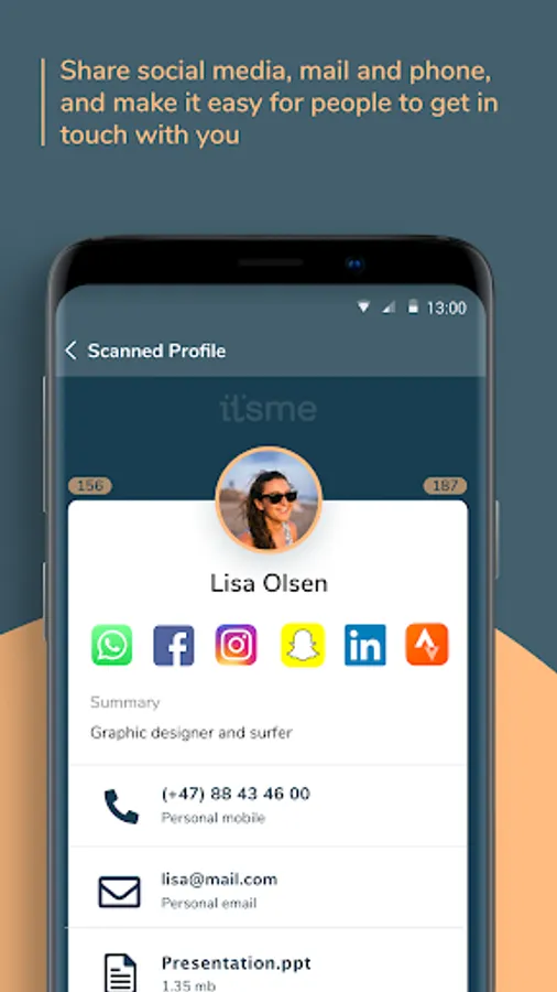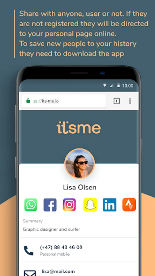 Itsme is the best way of connecting your social media and sharing them amongst newly met people. No name searching on Instagram, no wrong spelling on Snapchat, no stalking on Facebook and no searching for names at Linkedin. One touch on your phone and you are in