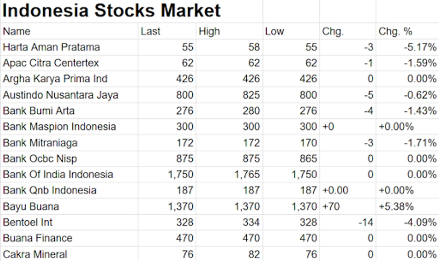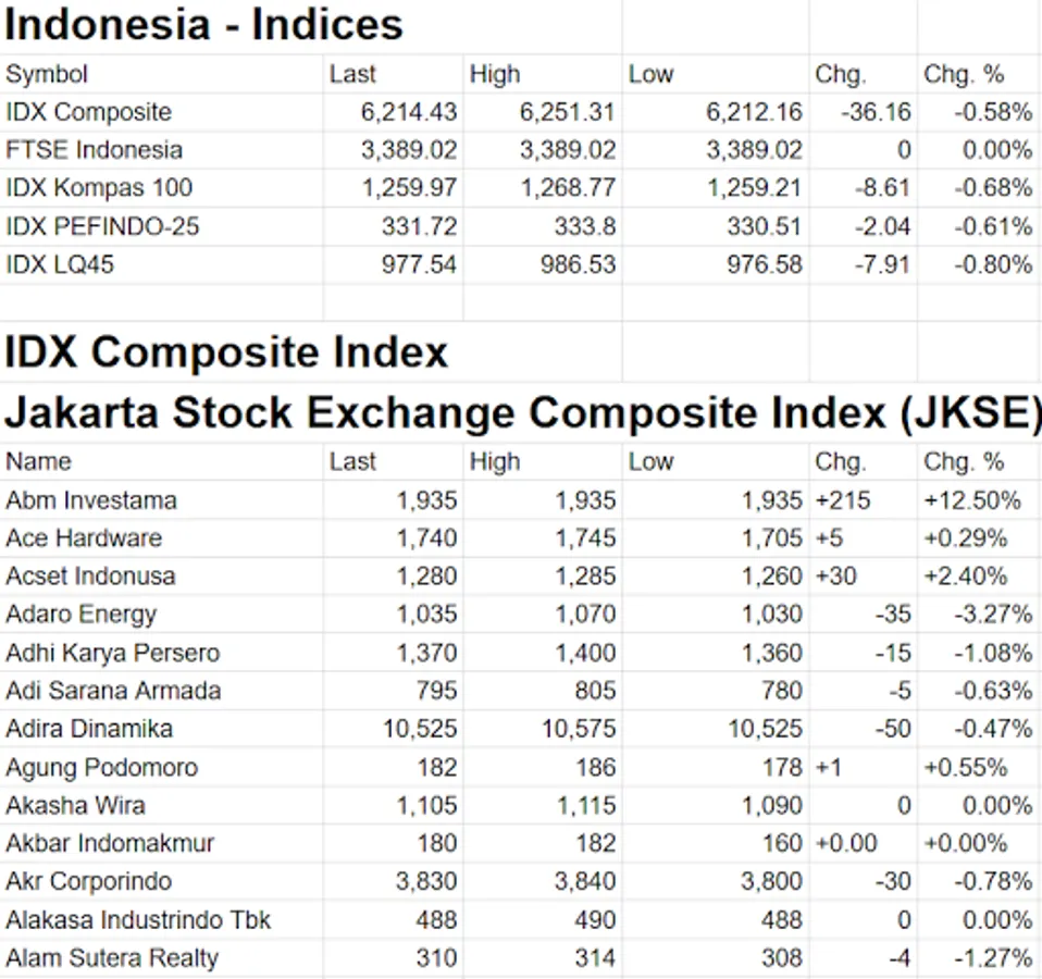 Powerful shares monitoring, stock tracking, indices monitoring app for Indonesia Stock Exchange, Indonesia Shares Quotes Prices, IDX Composite Index Jakarta Stock Exchange Composite Index (JKSE), FTSE Indonesia, IDX Kompas 100, IDX PEFINDO-25, IDX LQ45 and Worldwide Global Stock Exchange Indices around the world.