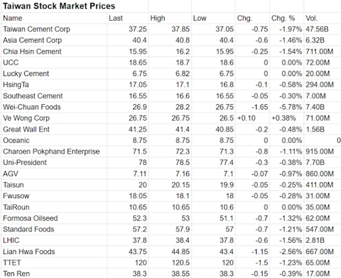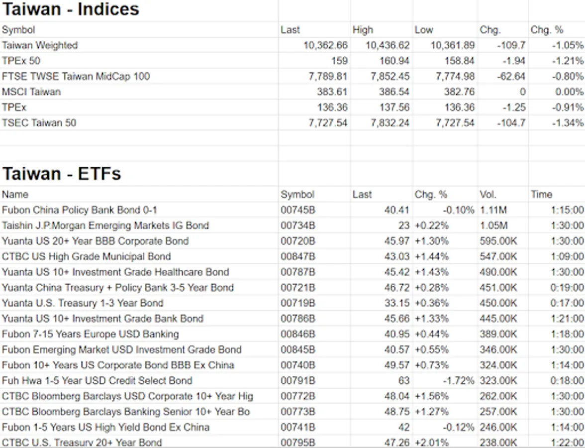 Taiwan stocks free stock market watch. Taiwan Shares Prices Quotes Latest Prices Movement. Taiwan Indices. Taiwan Stock Exchanges shares prices. TAIEX Index.