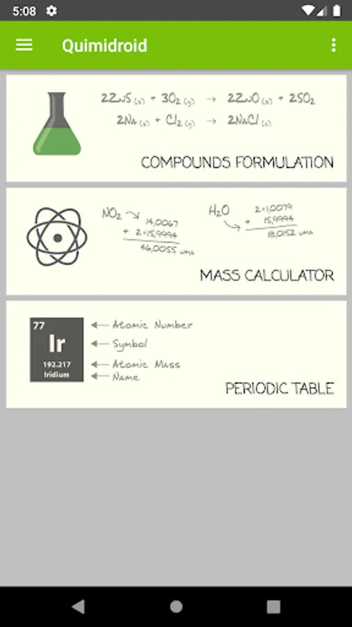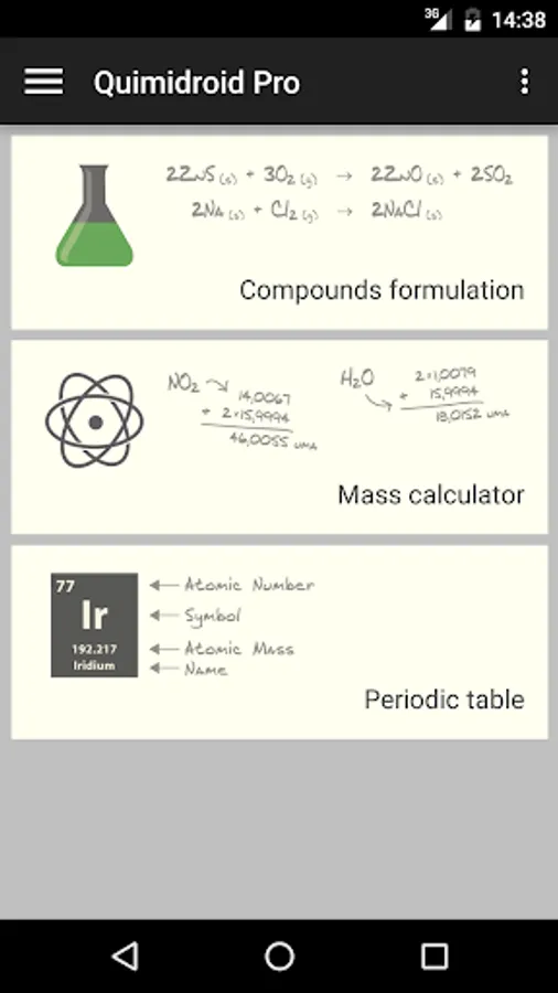 Quimidroid is a set of chemical tools designed for education and scientific research. Its main objective is to facilitate the learning of chemistry and become a teaching tool, either individually or in schools, as an instrument for self-correction. It also aims to streamline and energize the formulation for professionals in the sector or anyone interested in chemistry as an amateur.