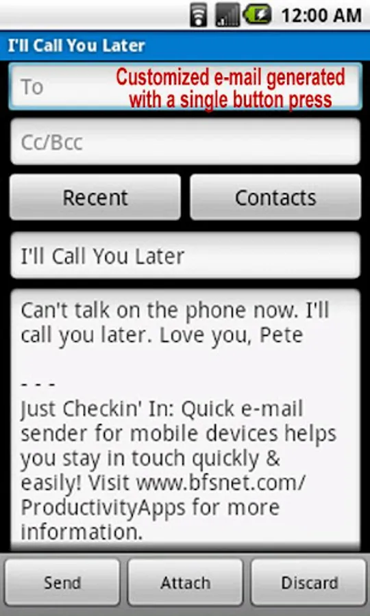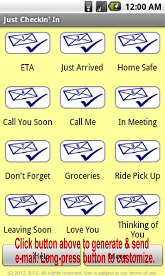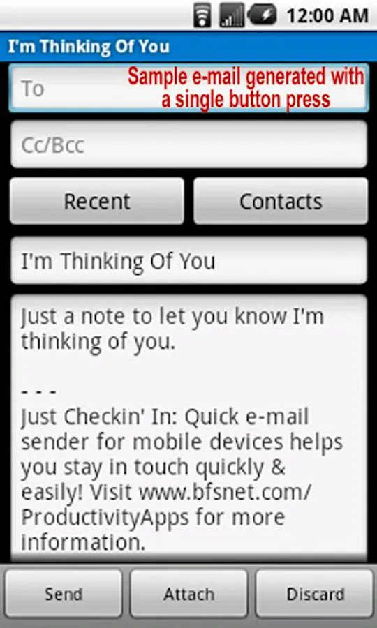 Just Checkin' In is a quick e-mail generator that can help you stay in touch quickly & easily with friends, family, co-workers and more - even during those busy moments. Features 24 standard e-mails that can be customized and sent almost instantly.