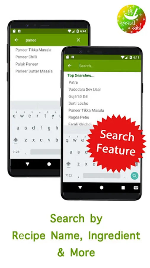 + Now search any recipe either by ingredient name like 'Paneer', 'Batata', 'Ringan' or by recipe name like ' Ragda Petis ' , ' Gujarati Dal ' or even by search terms like ' Street Food ', ' Healthy Food ', etc.