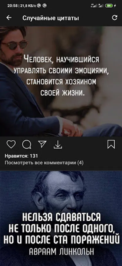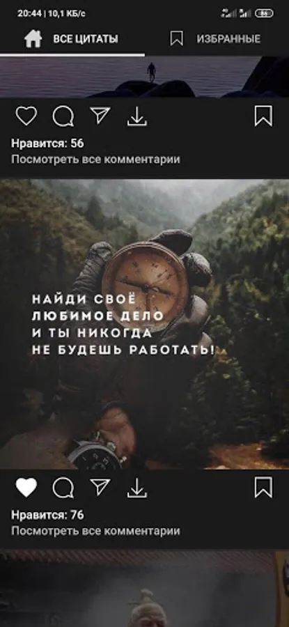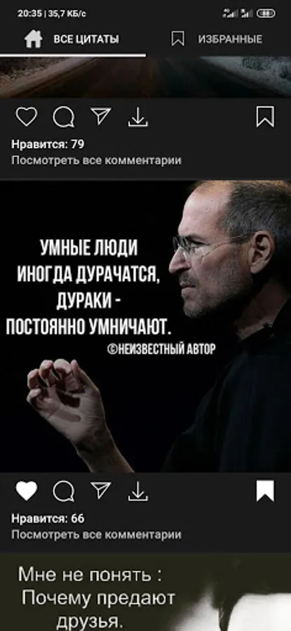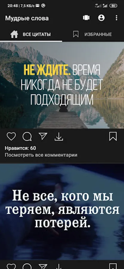 Applications selected stylish dark shade. It’s very convenient to share thoughts from the collection with friends in instant messengers or on social networks. The collection of quotes is constantly updated, and the application itself is regularly improved from a technological point of view.