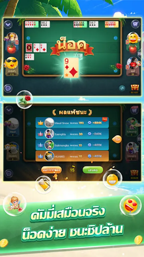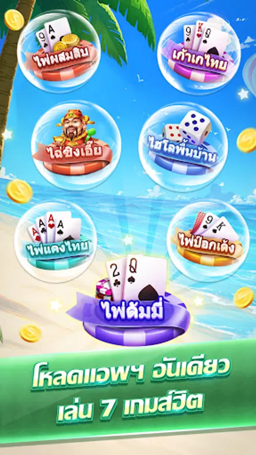 Dummy card or Dummy (also known as Black card / Thai Rummy) is a popular card game in Thailand. It also requires skill and memory. This app also has other popular games in Thailand. Including having fun Thai cards Pokdeng/Pokdeng that satisfies nine nines (including nine nines 2+2) that require skill Hi-Lo and gourds, crabs, popular local fish, exciting Caishing-Ea slots. Ten combination cards that are easy to play. In addition, you can also play fruit slots, wheels for 24 hours!