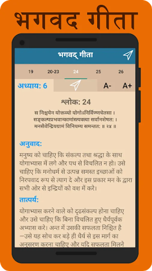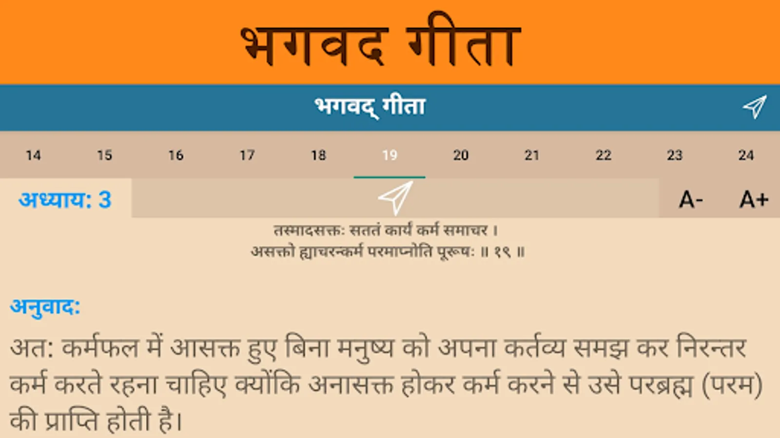Enhance your reading experience with the app's adjustable text size feature. Tailor the font size to your preference, whether you prefer larger fonts for easy reading or smaller fonts for a compact display. Immerse yourself in the teachings of the Bhagavad Gita in a way that feels most comfortable to you.