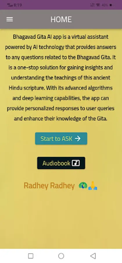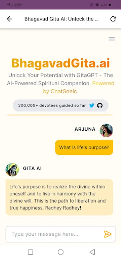 Bhagavad Gita AI app is a virtual assistant powered by AI technology that provides answers to any questions related to the Bhagavad Gita. It is a one-stop solution for gaining insights and understanding the teachings of this ancient Hindu scripture. With its advanced algorithms and deep learning capabilities, the app can provide personalized responses to user queries and enhance their knowledge of the Gita.