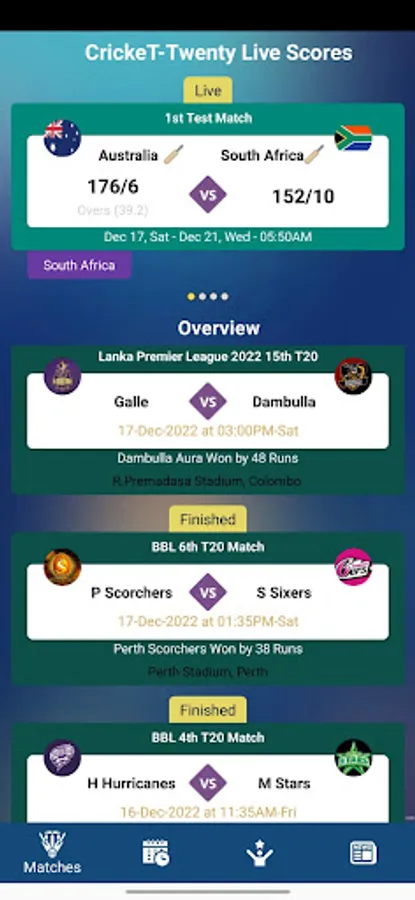 Cricket-Twenty Scores Updates app for Cricket fans and live match followers. Get live Cricket match score updates on your mobile for all international matches, T20 leagues. This app provides fast score updates and you will be able to check ball by ball runs and other live cricket score stats