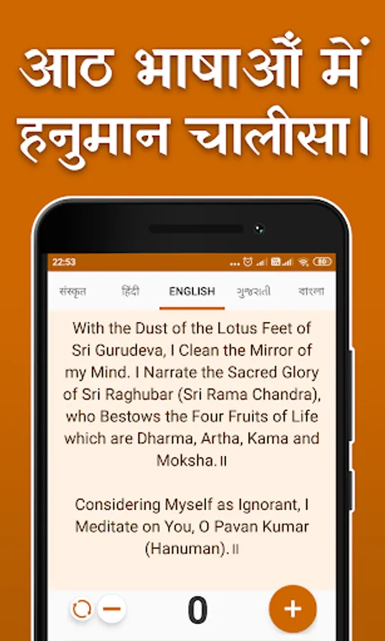 1. Hanuman Chalisa in 8 languages - The app has Hanuman chalisa in 8 different language along with translation.