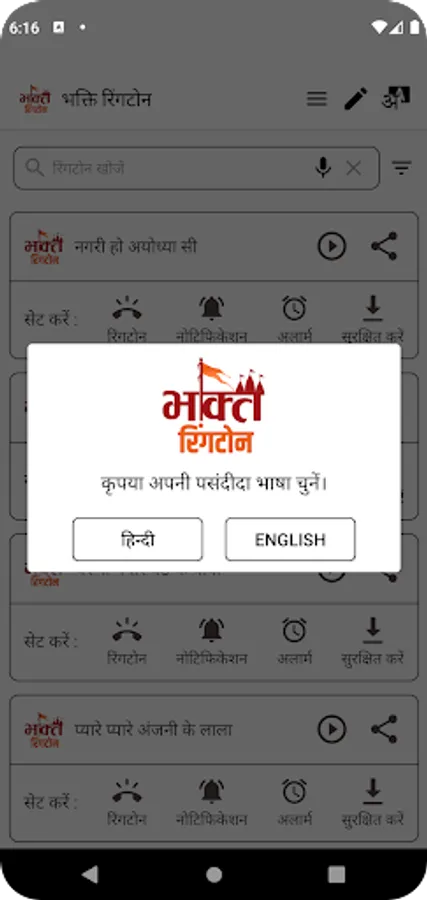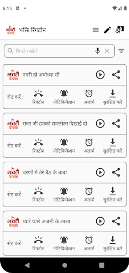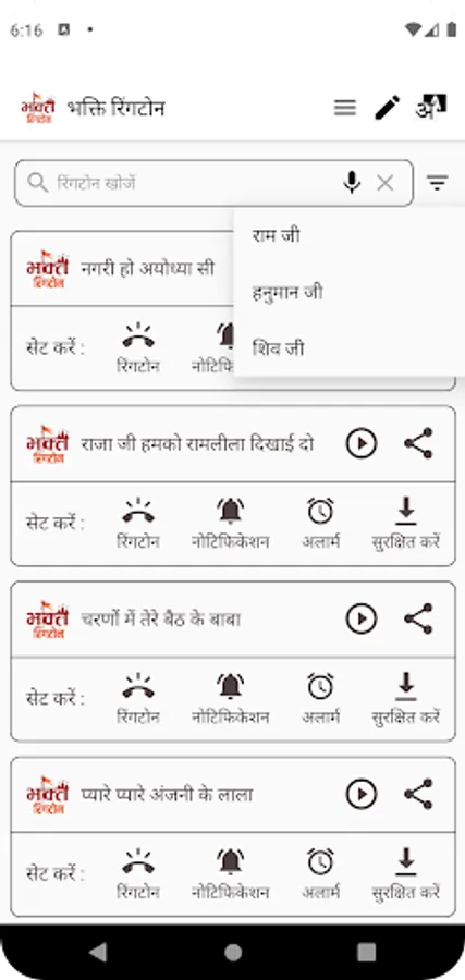 This app will give you all ringtones of Bhajans, Aarti, Chalisa, Mantra and devotional music related to all deities like Ram, Shiva, Hanuman, Khatushyam, Balaji, Ganga Maiya, Krishna, Ambe, Radha Rani, Mahadev, Bajrangbali, Ganesha and Shanidevta. Will get it here.