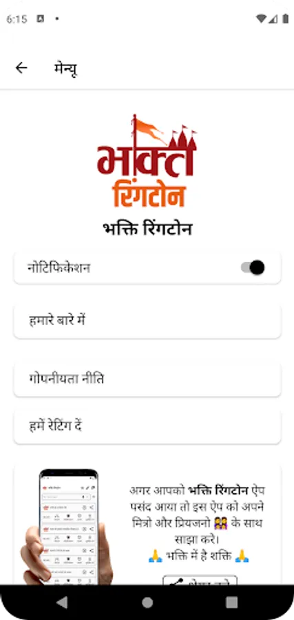 Bhakti ringtones app is a collection of most popular bhajan ringtones which you can use as ringtone, notification ringtone, alarm ringtone or contact ringtone. Devotional ringtones app is a must for you to start your day with alarm ringtones of all devotional hymns for divine remembrance.