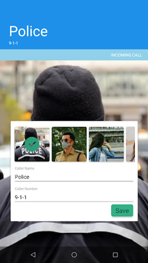 Choose predefined callers from the list. or create your own call screen, enter name, phone number and image from your photo gallery.
