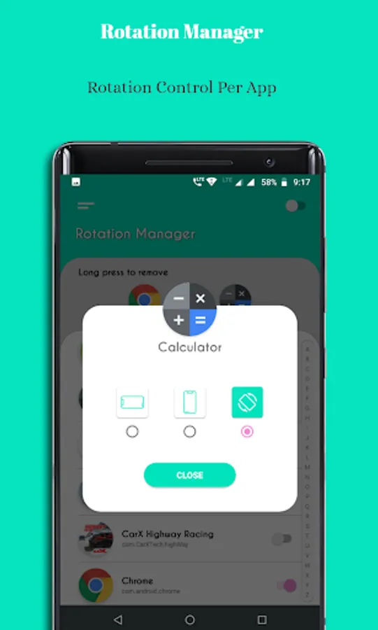 2. App shows different Rotation mode, Landscape, Portrait, Auto. Choose the mode for the app you selected.