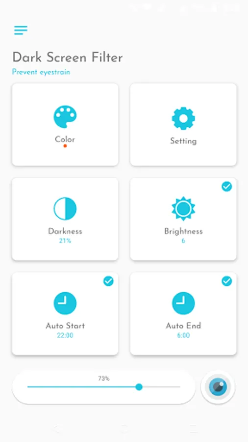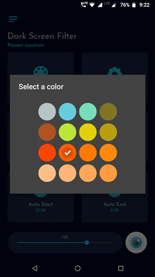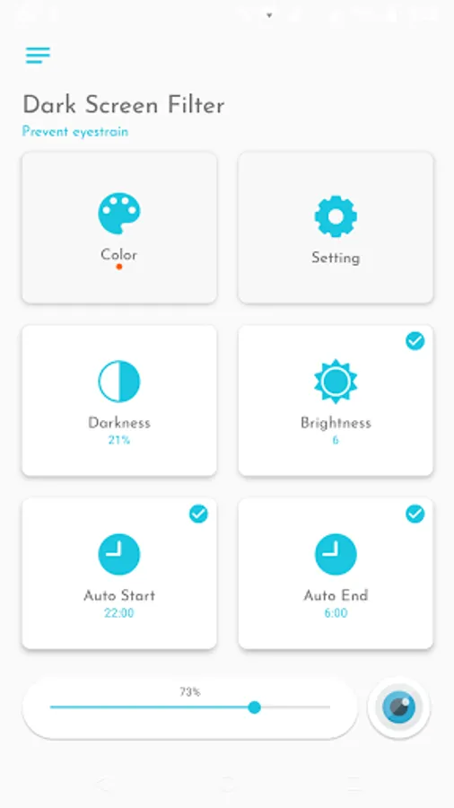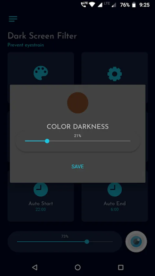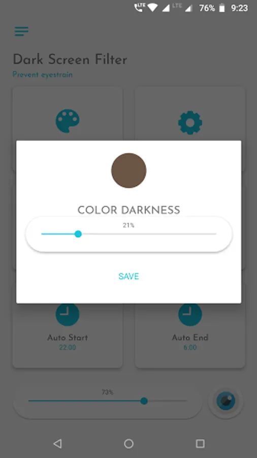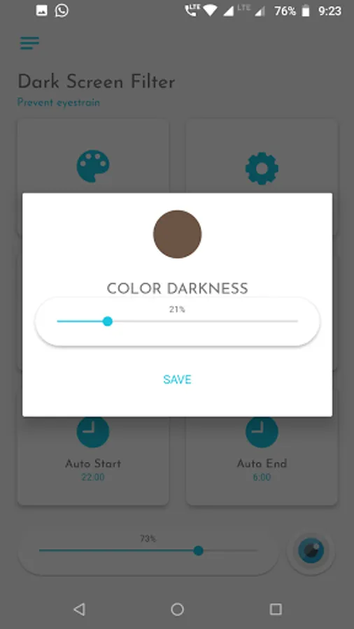 App reduces the blue light by applying color screen filters to your phone screen. With auto start and auto end options, you can configure app to activate screen filter during night automatically.