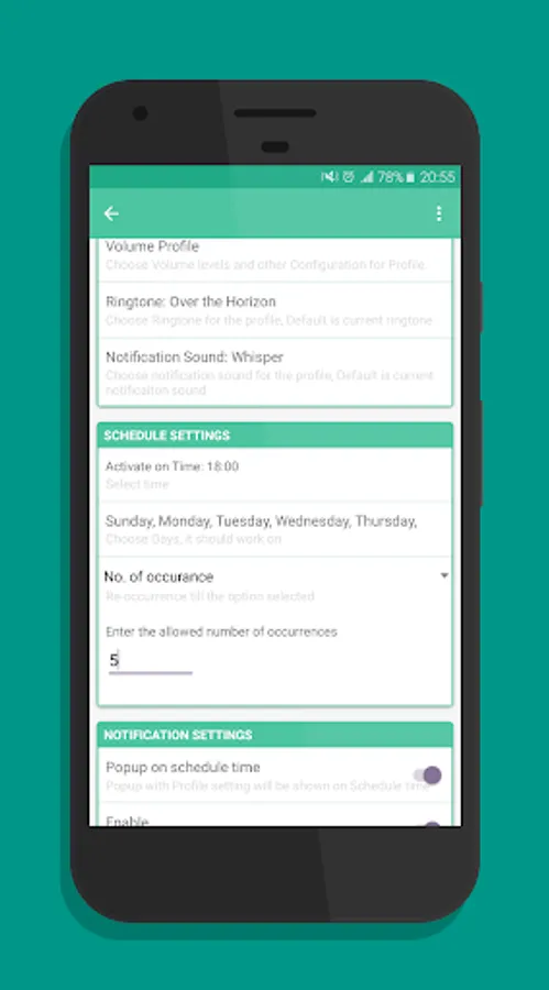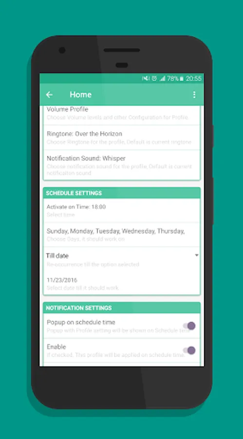Control volume levels and ringer, change ringtone and notification tone on given time.