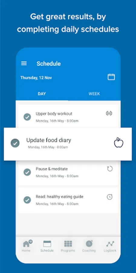 Within the app you can view and follow your customised training programs, see your up to date schedule and follow all your individulaised nutrutional plans/progress photos/ results tracking etc.
