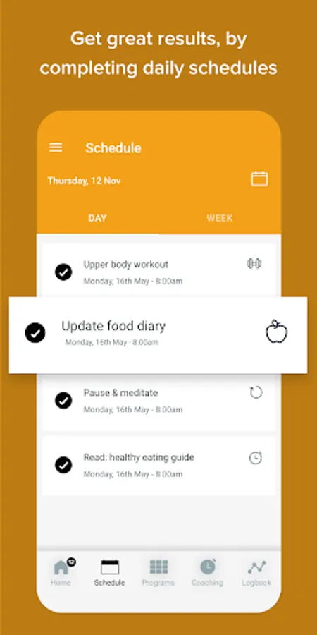Log in to get your workout and lifestyle tasks for the day, log your activities and message your Coach all form with in the app.