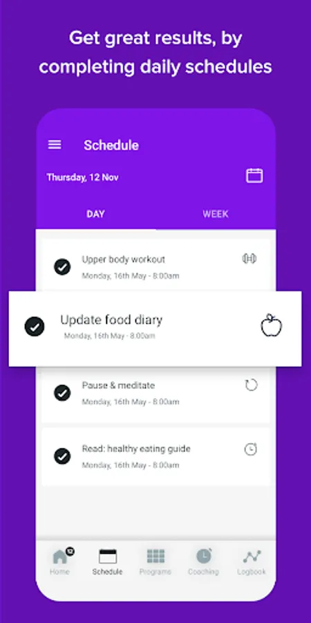 The app will notify you of any tasks and challenges that need to be completed as part of your programme. You will also find nutrition plans, recipes and educational documentation to help you achieve your goals.