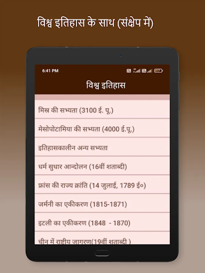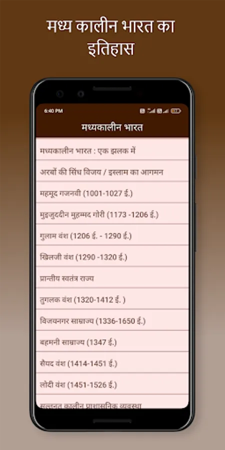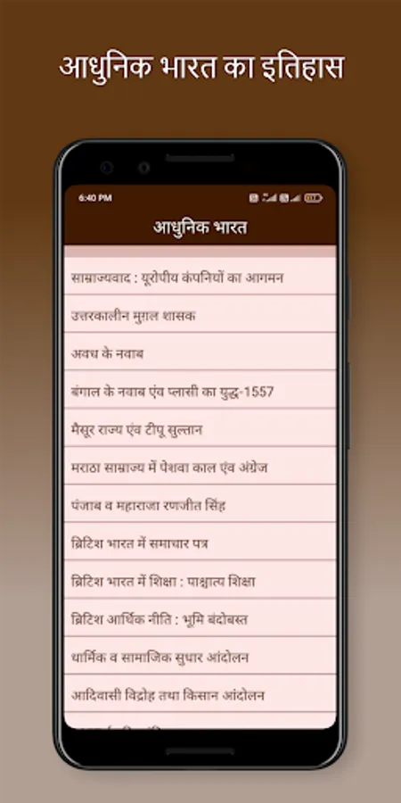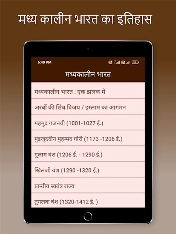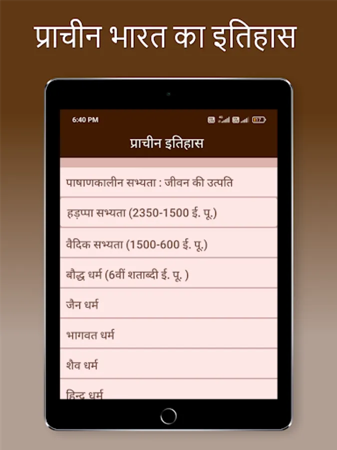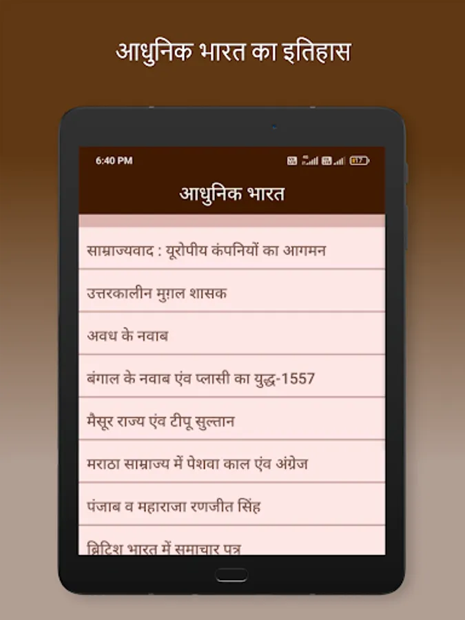 Indian History book in hindi in an app format are providing complete history meterials in hindi. This App Covers All the Topics of Indian History from the Ancient History, Medieval History and Modern History of India topic wise.
